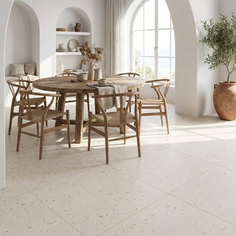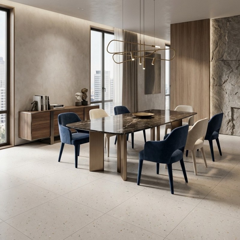 Son grand format carré 80x80 cm permet de mettre pleinement en valeur la richesse du motif terrazzo tout en assurant une continuité visuelle élégante. Ce format est particulièrement adapté aux pièces de vie ouvertes, aux espaces créatifs ou aux intérieurs contemporains où le sol devient un véritable élément décoratif.