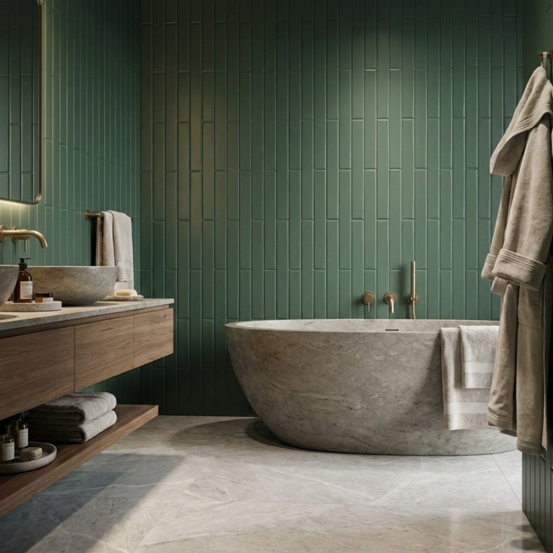 Associez-le à des matériaux comme le bois ou le béton pour un contraste élégant. Des accessoires en céramique et des plantes viendront compléter cet ensemble naturel et rafraîchissant. Ce carrelage est idéal pour sublimer vos espaces avec une touche de verdure et de sérénité.