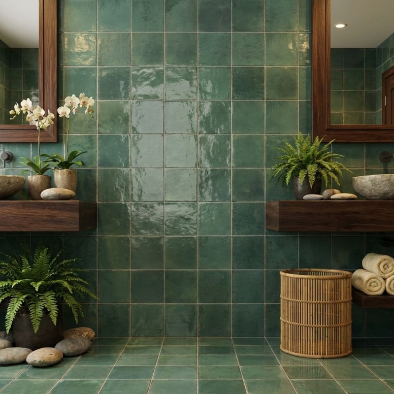 Ce carrelage est idéal pour des espaces comme la salle de bain, la cuisine, ou encore pour un mur décoratif dans le salon. La couleur "Selva", qui signifie "forêt", apporte une touche organique et apaisante, très tendance dans les décors actuels qui prônent un retour aux sources. Les reflets et les nuances du vert ajoutent une richesse visuelle unique, capturant la lumière et la redistribuant de manière subtile, créant ainsi une atmosphère apaisante et ressourçante.