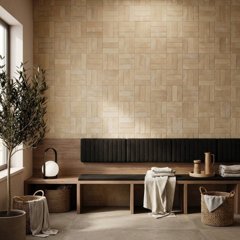 Pour un style bohème, associez le BEJMAT BISCUIT avec des textiles colorés, des accessoires en osier et des plantes vertes. Pour une ambiance plus contemporaine, combinez-le avec des éléments en acier noir et des surfaces en béton lissé. Des touches de bois clair viendront compléter l'ensemble et apporter une note de chaleur. Ce carrelage est également idéal pour un style méditerranéen, avec des accessoires en terre cuite et des textiles en lin.