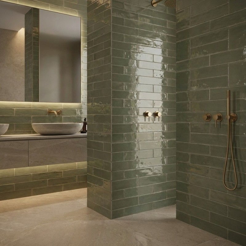 Pour un style luxueux, associez le REBELS MOSS GLOSS avec des accessoires en métal doré et des surfaces en marbre blanc pour accentuer l'élégance du vert brillant. Pour une ambiance plus naturelle, combinez-le avec du bois clair et des textiles en lin. Les plantes vertes viendront compléter l'ensemble pour un effet harmonieux et organique. Ce carrelage est également idéal pour des espaces modernes cherchant à intégrer une touche de couleur, tout en restant fidèle à une esthétique minimaliste.