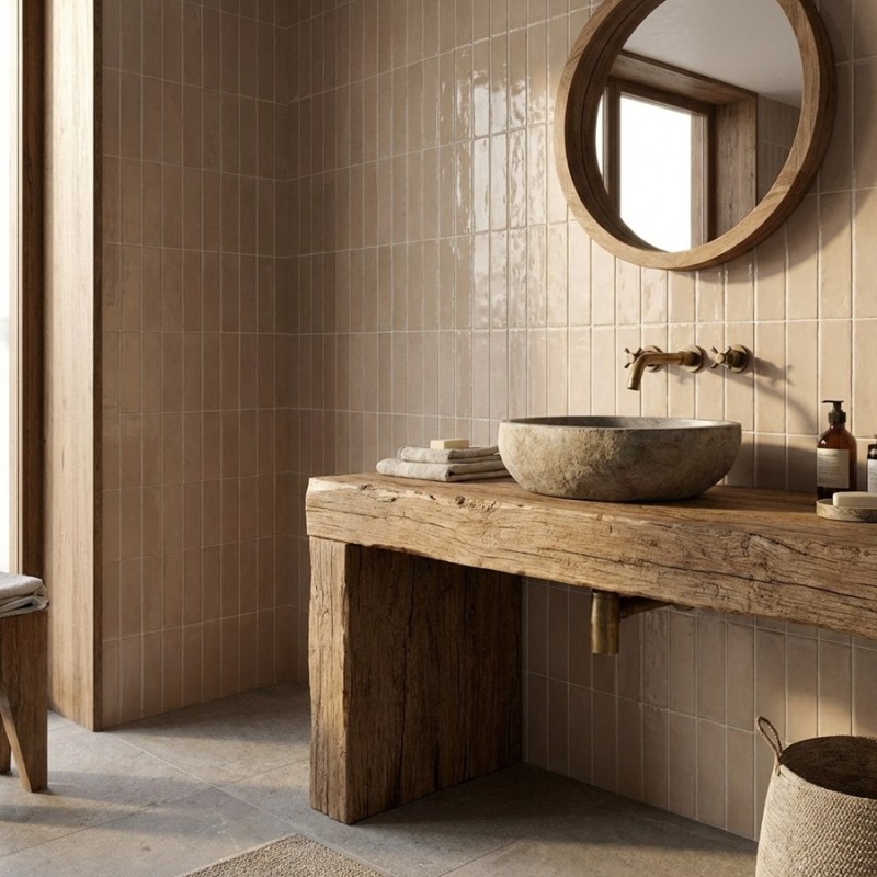 Pour un style industriel, associez le REBELS TAUPE GLOSS avec des éléments en acier brossé et des accessoires en bois brut. Pour une ambiance plus romantique, combinez-le avec des textiles doux et des tons neutres, comme le beige et le rose poudré. Ce carrelage s'adapte aussi parfaitement à un style bohème, marié avec des plantes suspendues et des objets artisanaux.
