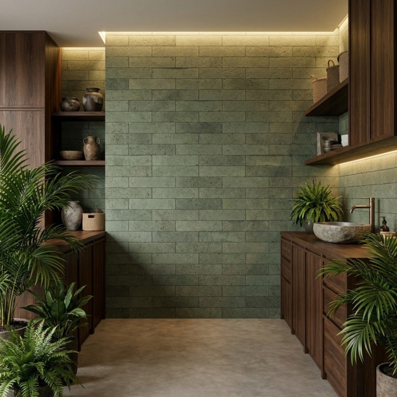 Chroma Green se marie superbement avec du bois clair, du chêne naturel, du terrazzo ou des accents dorés. Dans la cuisine, il apporte une note végétale raffinée ; dans la salle de bain, il crée une atmosphère zen rappelant les hammams traditionnels. Associé à Chroma White, Grey ou Terracotta, il permet de composer un mur décoratif riche, authentique et plein de personnalité.