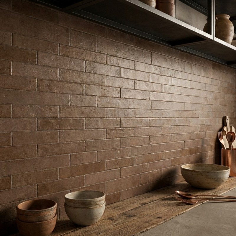 Le format 7,5×30 permet une pose dynamique : horizontale pour un rendu classique, verticale pour étirer visuellement la pièce, ou en chevrons pour un style plus contemporain. Associé à un sol minéral ou bois clair, Mallorca Brown crée un ensemble riche et harmonieux.