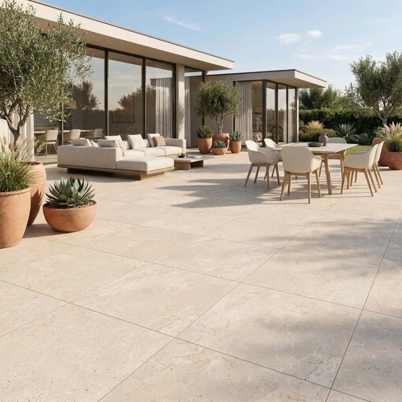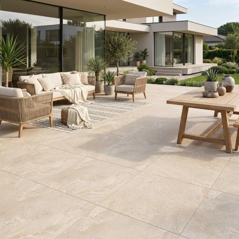 Le carrelage Keita Origine almond s’associe parfaitement avec du bois naturel, des graviers décoratifs ou des éléments végétaux pour créer une ambiance extérieure chaleureuse et authentique. Il fonctionne aussi très bien avec du mobilier contemporain pour un rendu plus design.