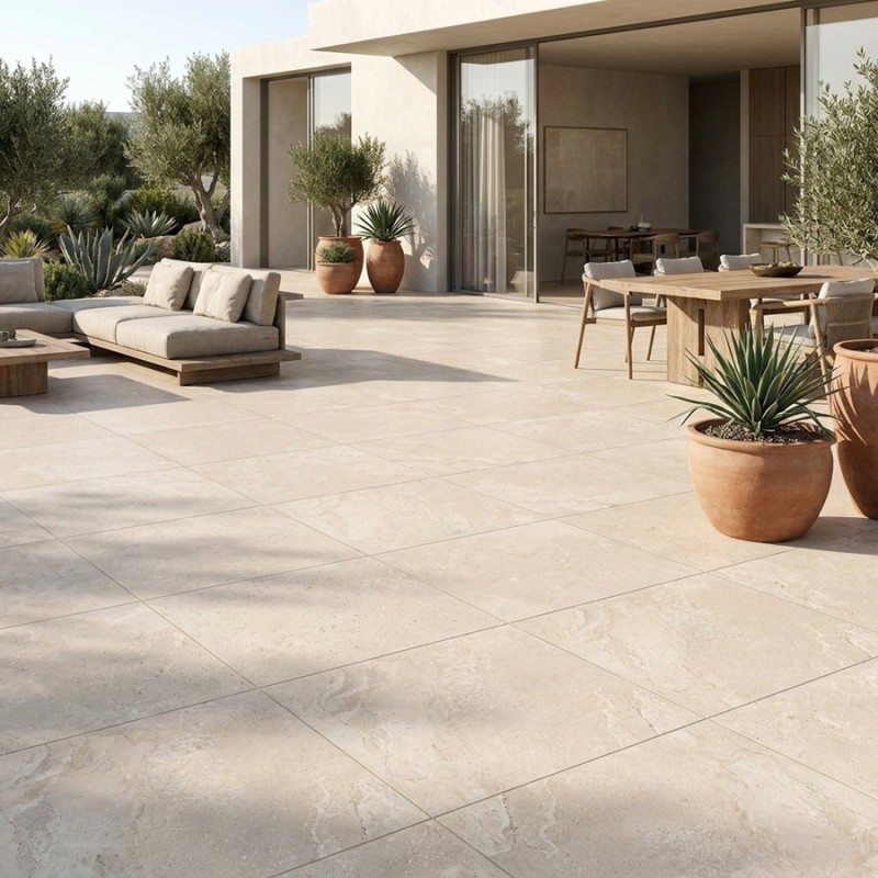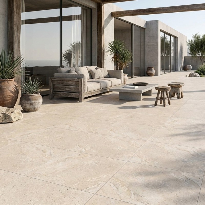 Sa finition R11 antidérapante est spécialement conçue pour les zones extérieures : terrasses, allées, plages de piscine ou coursives. Ce carrelage garantit une excellente adhérence même en milieu humide, tout en conservant un toucher agréable.