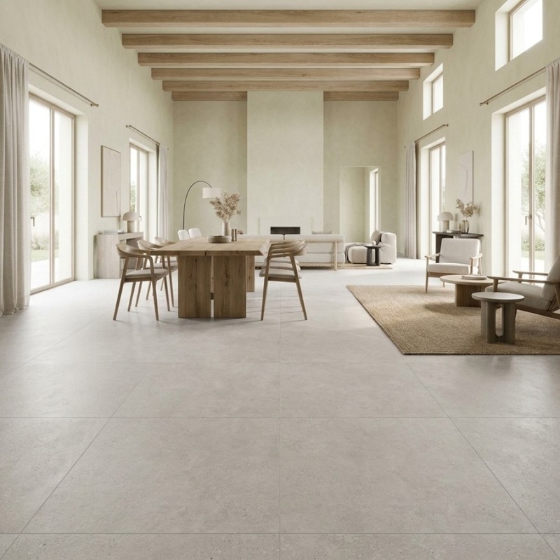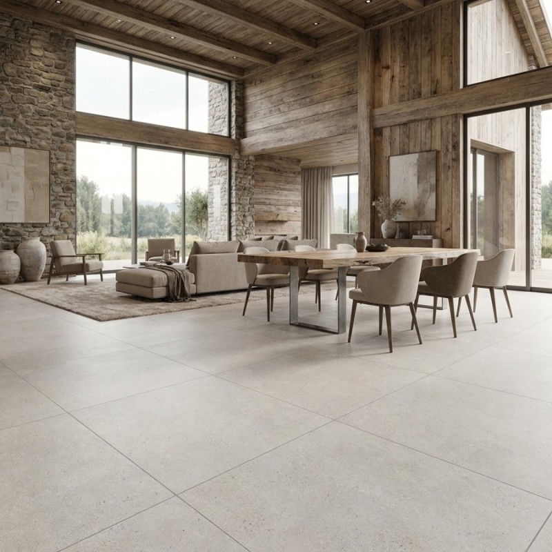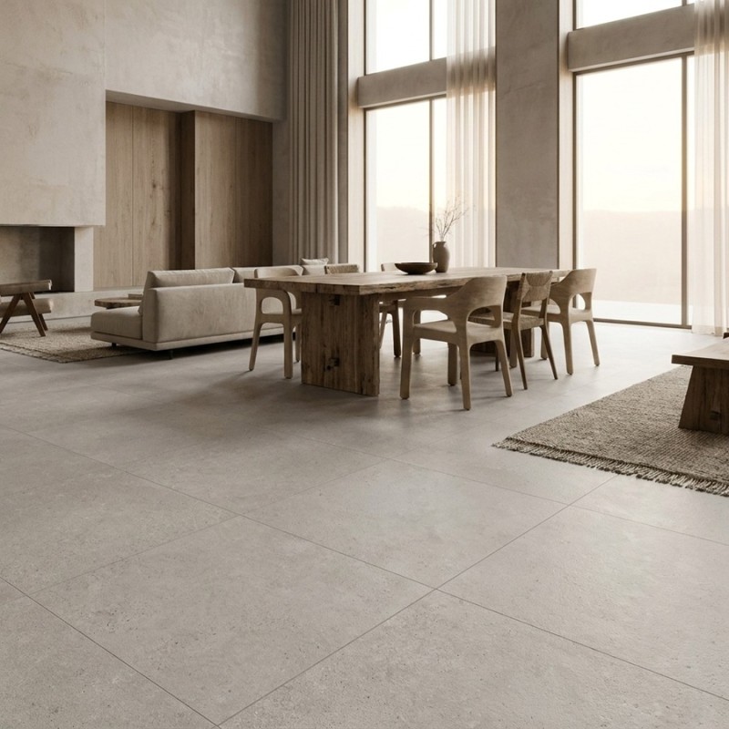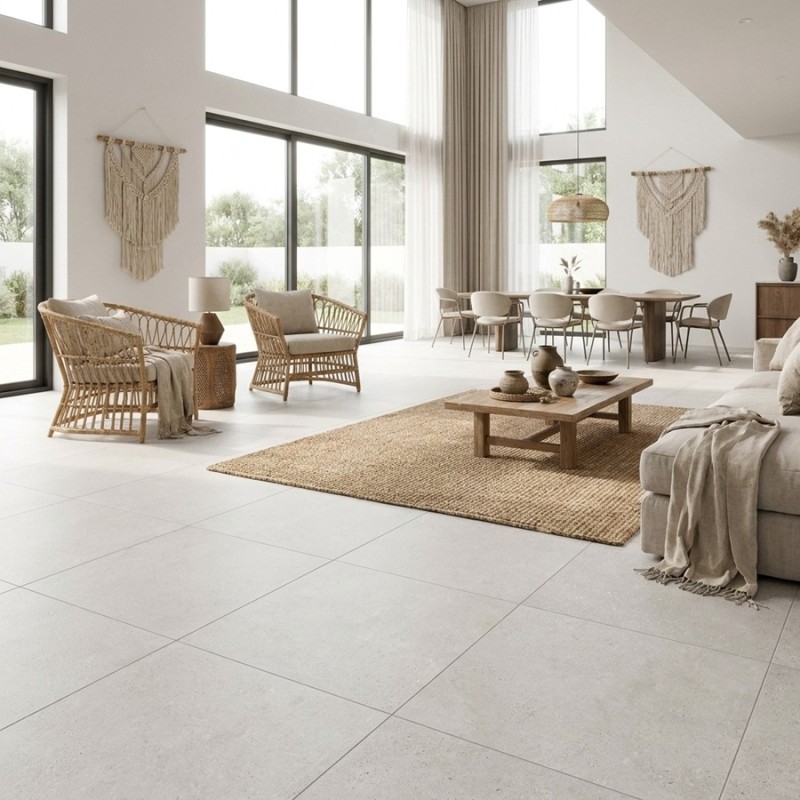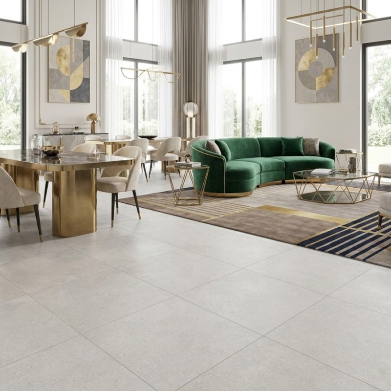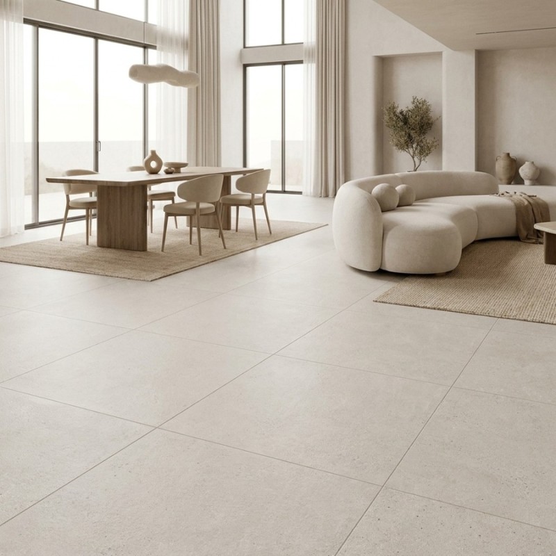 Inspiré de la pierre calcaire naturelle, ce carrelage 100x100 séduit par sa teinte pearl subtile, entre blanc cassé et nuances minérales, parfaite pour agrandir visuellement les espaces. Son grand format limite les joints et crée une surface fluide, très recherchée dans les intérieurs contemporains.