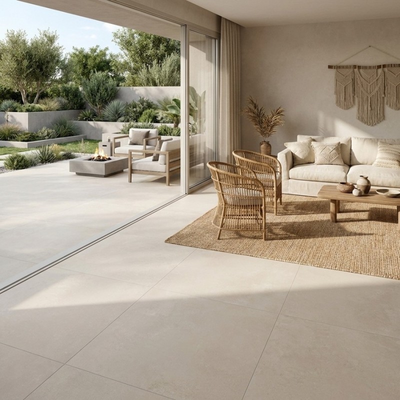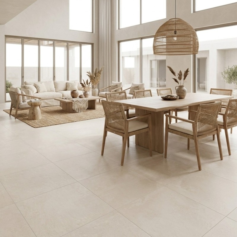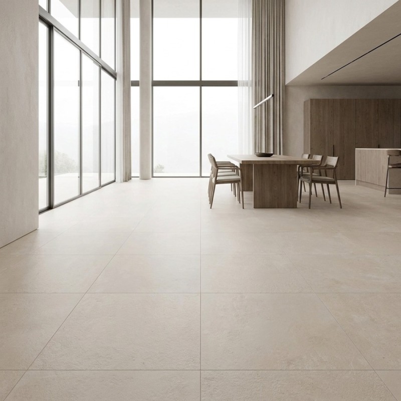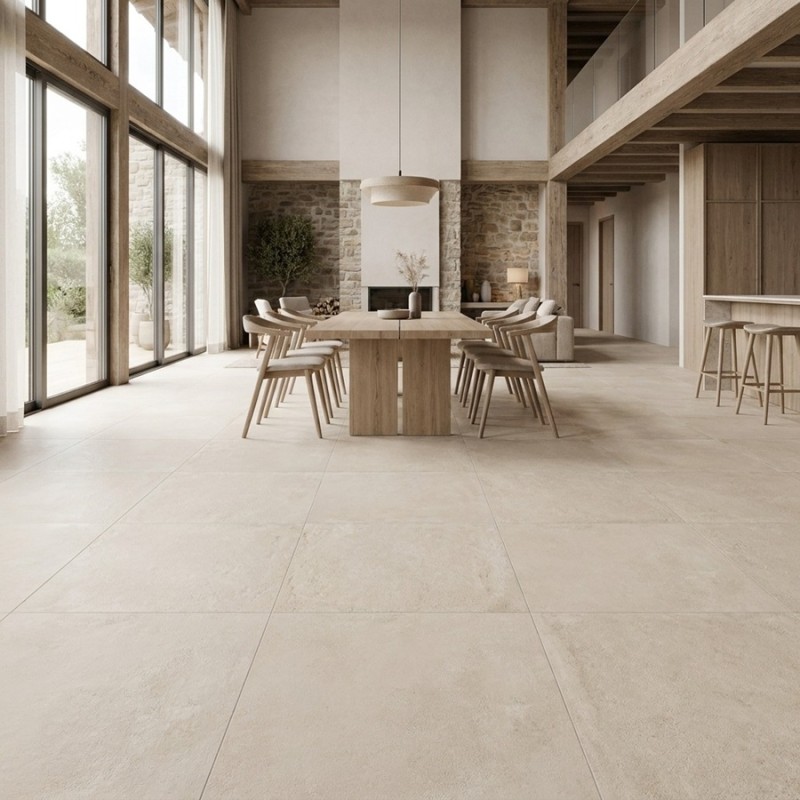 Le carrelage Zira ciment crema s’associe parfaitement avec du bois clair, des tons beiges ou des matières naturelles pour une ambiance chaleureuse et contemporaine. Il peut aussi être combiné avec des éléments noirs ou métalliques pour un style plus industriel.