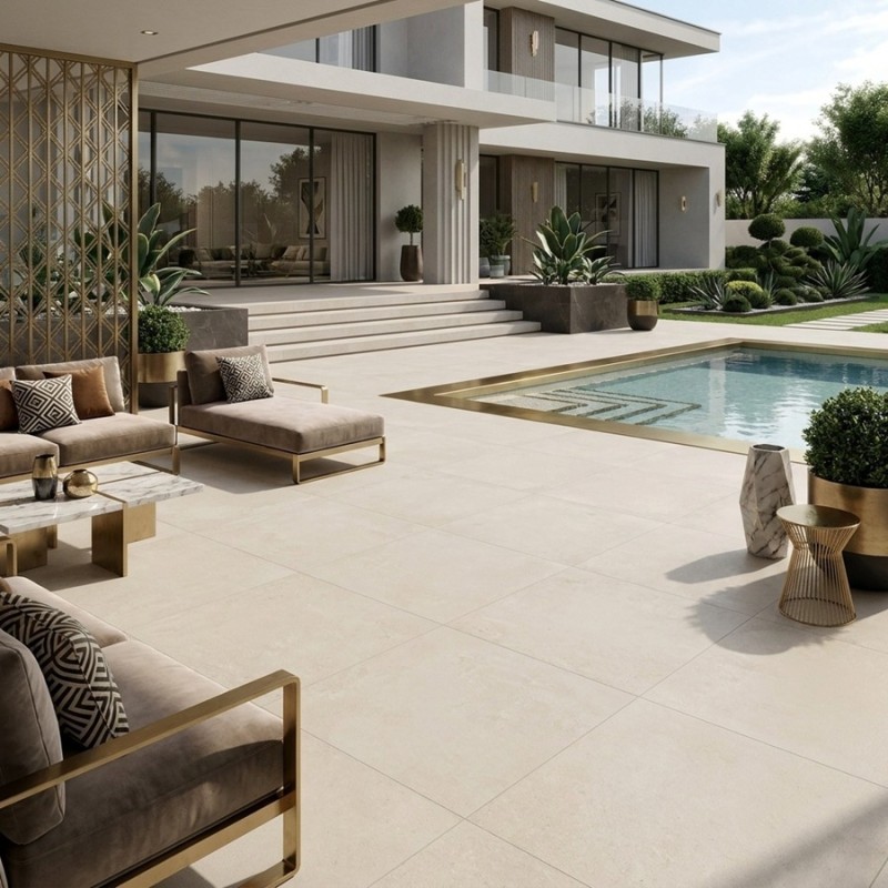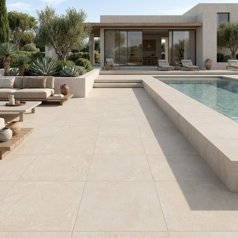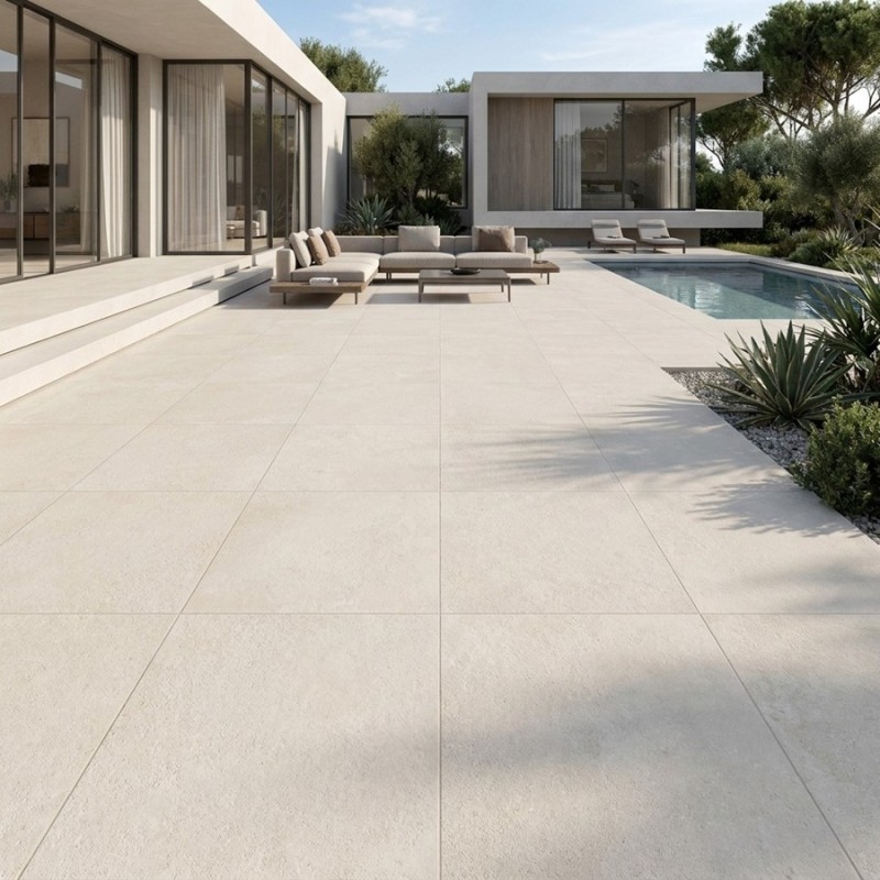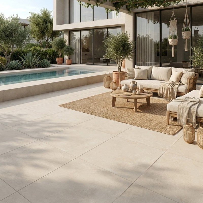Le carrelage Zira ciment crema s’associe parfaitement avec du bois, du mobilier extérieur en aluminium ou des éléments végétaux pour créer une ambiance moderne et chaleureuse. Il peut aussi être combiné avec des tons plus foncés pour un contraste contemporain.