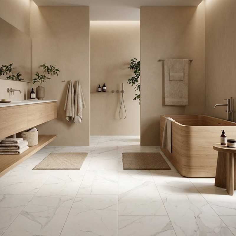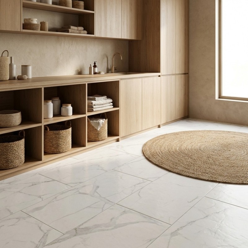 Pour un style intemporel, misez sur l'élégance d’un sol effet marbre blanc.