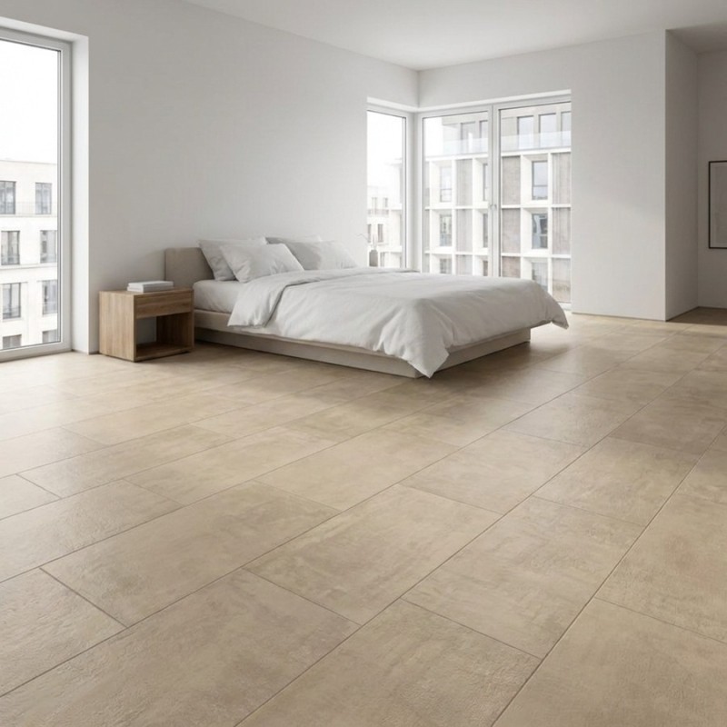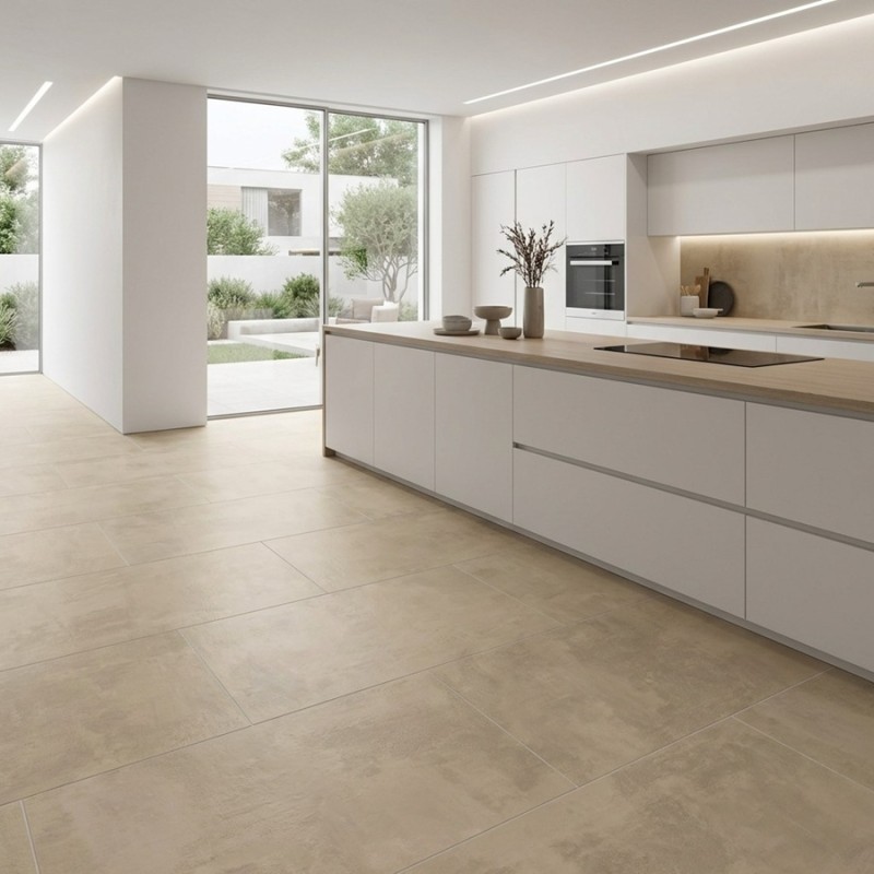 Un sol effet béton de couleur claire pour une atmosphère douce et élégante.