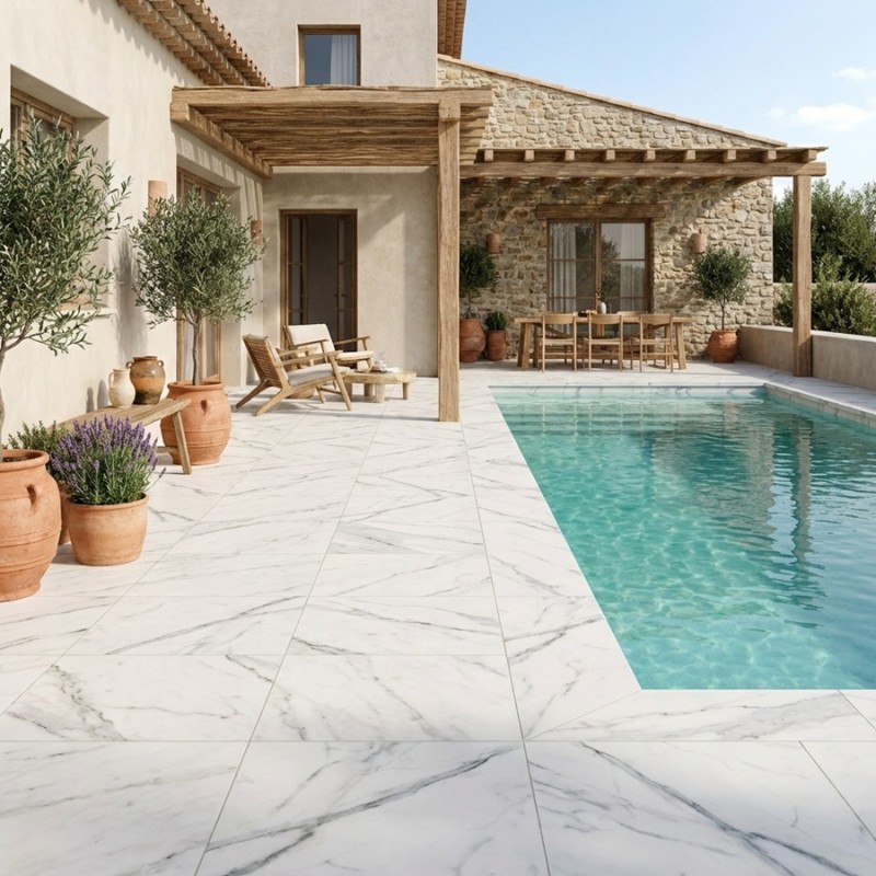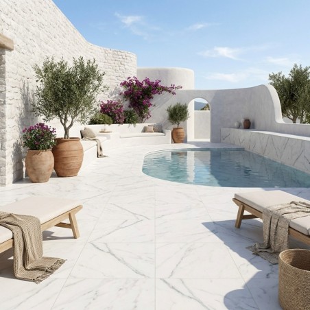 Élégance et pureté avec l'effet marbre blancInspirez-vous de la beauté intemporelle du marbre blanc pour créer un espace extérieur empreint d'élégance et de sophistication. La dalle sur plots Ice allie parfaitement la noblesse du marbre à une couleur blanche éclatante, apportant une touche de raffinement unique à votre terrasse.