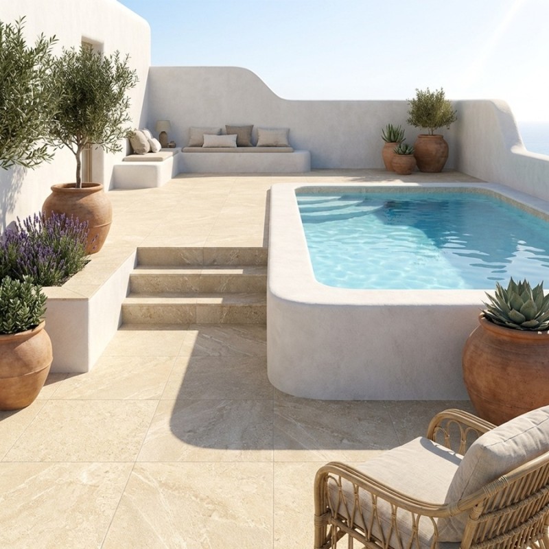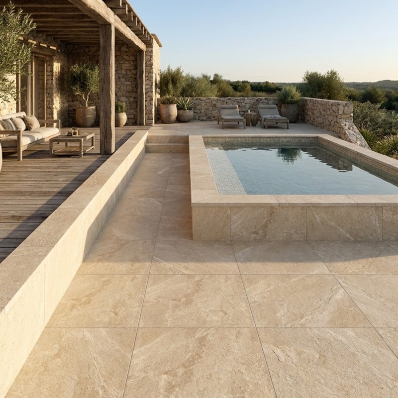 Pour une décoration extérieure harmonieuse, combinez les QUANTUM CREAM avec des meubles de jardin en bois clair et des textiles aux couleurs neutres. Ajoutez des accessoires en pierre ou en métal pour compléter l'ensemble, créant un espace accueillant et élégant. Ces dalles sont idéales pour transformer votre terrasse ou patio en un lieu de détente naturel et chic.