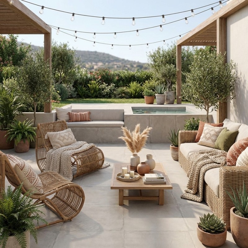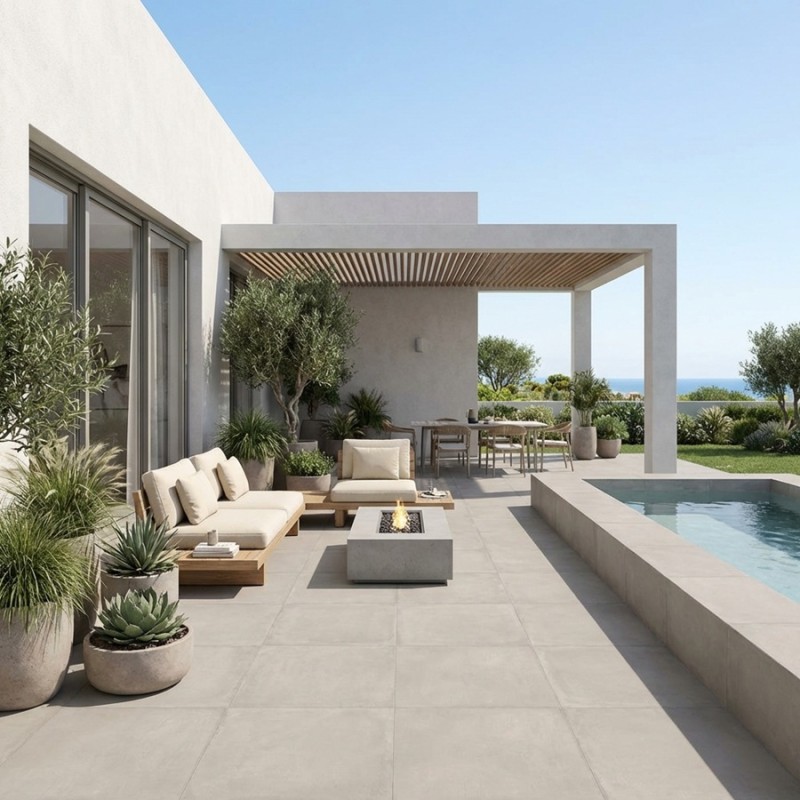 Pour une décoration harmonieuse, associez les LIGHT PERLA avec des meubles de jardin en bois clair ou en rotin, et des accessoires aux couleurs pastel. Des plantes en pot et des éléments décoratifs en céramique ou en verre complètent parfaitement l'ensemble, créant un espace extérieur accueillant et chic. Ces dalles sont idéales pour transformer votre terrasse ou patio en un lieu de détente élégant et lumineux.