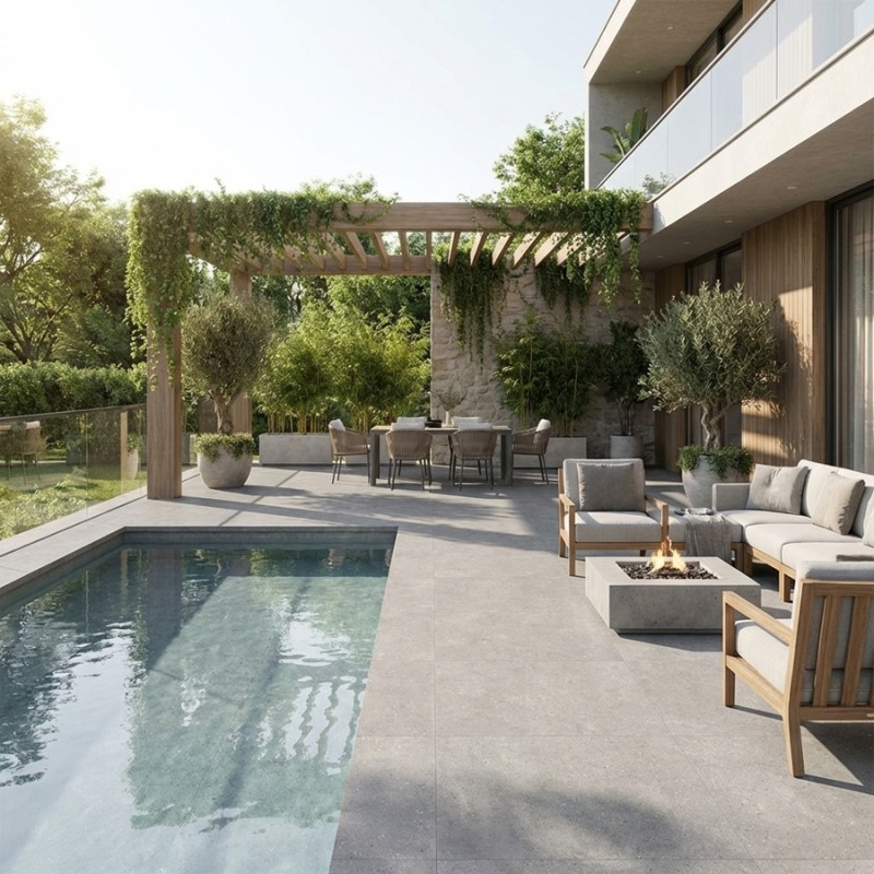 Pour intégrer ces dalles dans votre espace extérieur, pensez à les associer avec des meubles de jardin aux lignes épurées et des accents métalliques. Ajoutez des touches de verdure avec des plantes en pot ou des haies pour contraster avec la sobriété des dalles. Les DORSET PLATA sont parfaites pour créer des espaces de vie extérieurs élégants et accueillants, où le design moderne rencontre la fonctionnalité.