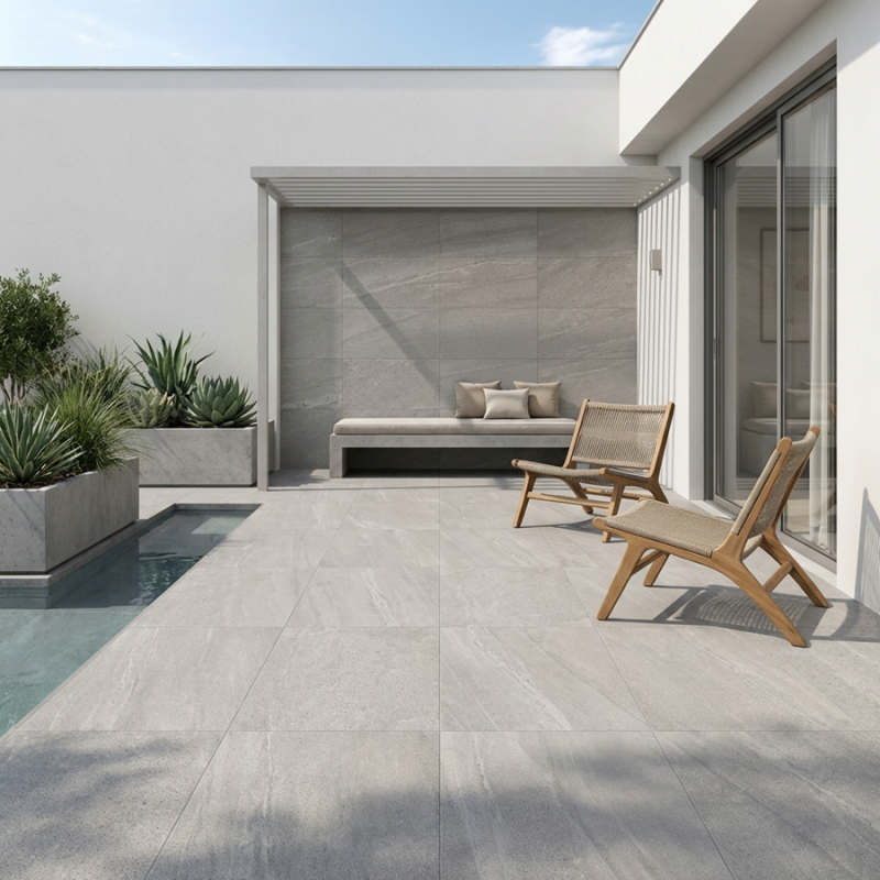 Avec son effet pierre contemporain et sa teinte gris clair Perla, la dalle sur plots EDDYSTONE Perla 60x60 est idéale pour une terrasse moderne, facile à associer et lumineuse. Parfaite pour une dalle sur plots terrasse, elle complète aussi l’univers dalle effet pierre.