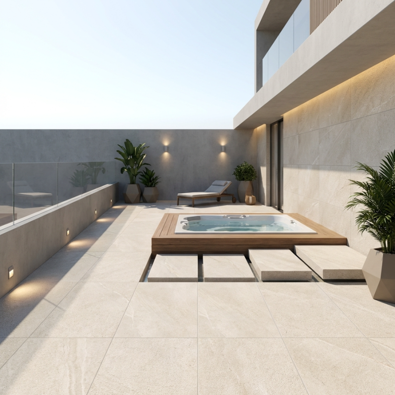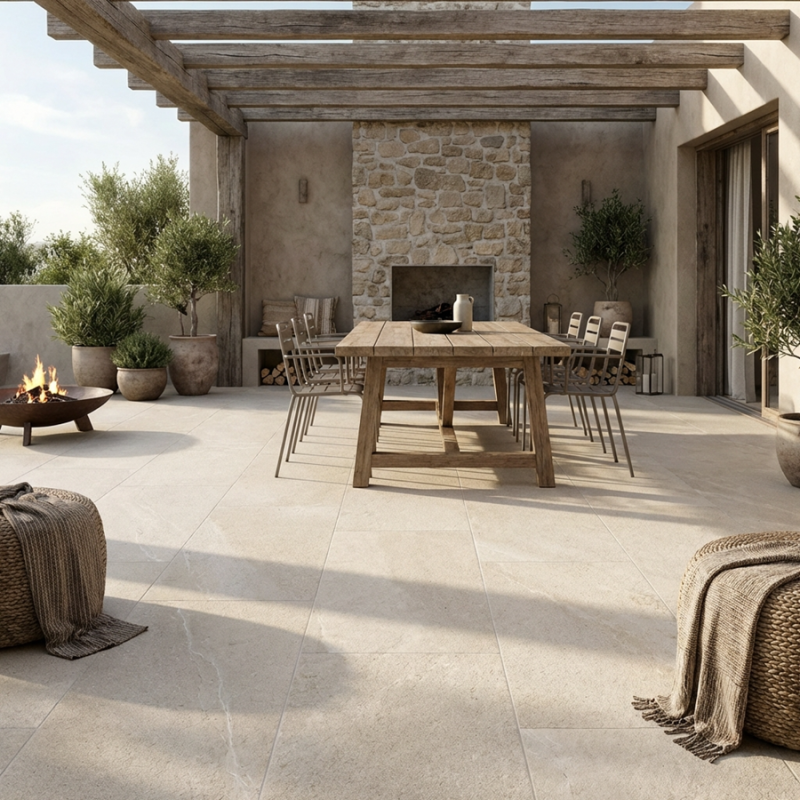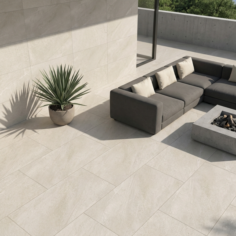Avec son rendu pierre très lumineux, la dalle sur plots EDDYSTONE Blanco 60x120 est parfaite pour agrandir visuellement l’espace et donner un style épuré à la terrasse. Elle est idéale pour une dalle sur plots terrasse et s’intègre dans la sélection dalle effet pierre.
