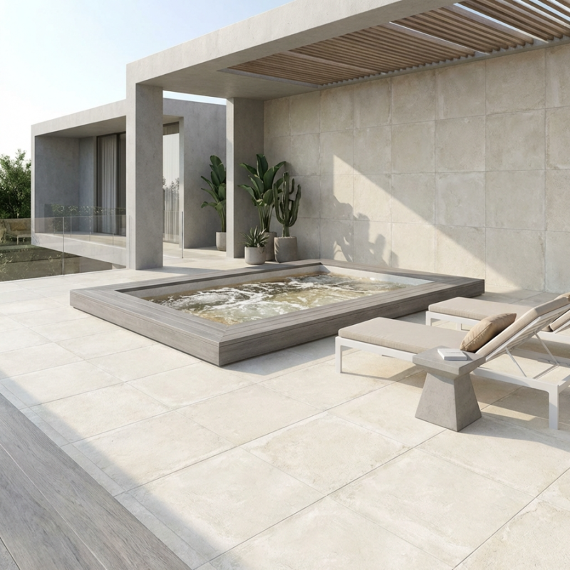 Conçu pour les terrasses modernes, le modèle Ground Arena 90x90 cm séduit par ses dimensions généreuses et son aspect pierre structuré. Sa surface antidérapante R11 garantit la sécurité sur sol mouillé, tandis que la pose sur plots facilite l'installation. Résistant, élégant et pratique, il s’intègre parfaitement aux extérieurs contemporains.