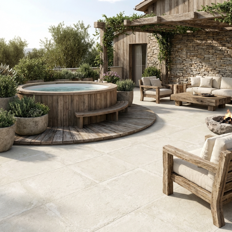 Avec sa teinte beige sable Arena et son format 90x90, la dalle GROUND apporte un rendu chaleureux et très naturel à la terrasse. Elle s’intègre parfaitement dans un aménagement en dalle sur plots terrasse, tout en conservant l’esthétique d’une dalle effet pierre. Grâce à sa finition antidérapante R11, elle se pose sur plots terrasse et se décline aussi en formats 60x120 / 60x90 / 60x60