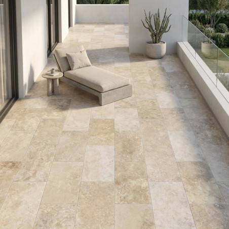 Harmonie intérieure/extérieure : associez cette dalle à la version carrelage travertin intérieur 60x90, idéale pour la cuisine, le salon ou toute autre pièce à vivre.
