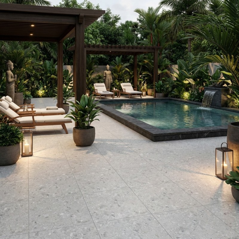 Dans sa version ivoire, la collection GEOTECH met en avant une teinte claire, subtilement chaude, parfaite pour créer un espace extérieur apaisant et raffiné. Le terrazzo se dévoile ici dans une lecture plus délicate : des éclats minéraux finement distribués, une texture visuelle douce et une luminosité idéale pour les terrasses baignées de soleil. Cette couleur se marie particulièrement bien avec les architectures contemporaines, les extérieurs méditerranéens et les jardins minimalistes.