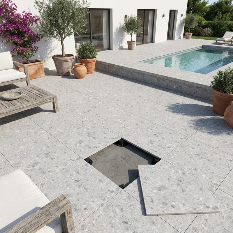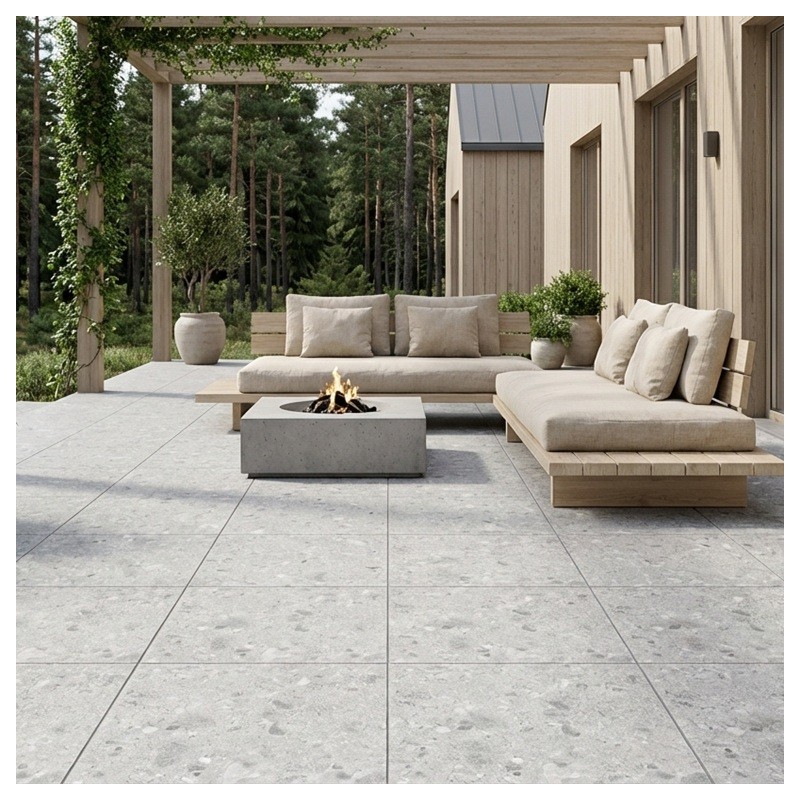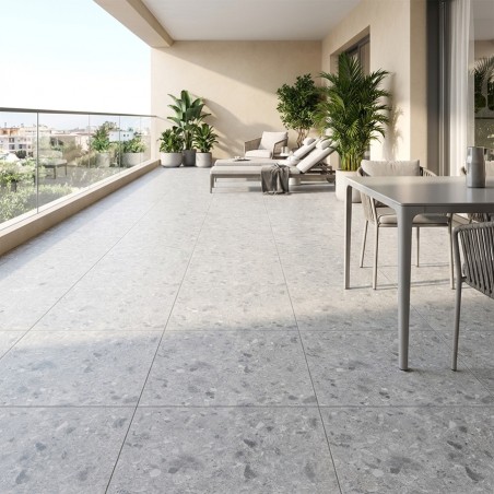 Graphique et lumineuse, la dalle GEOTECH Light Grey revisite le terrazzo Ceppo di Gré dans une teinte gris clair facile à associer. Idéale pour une terrasse en dalle sur plots terrasse, elle complète parfaitement la sélection dalle effet pierre. Sa finition R11 la rend adaptée aux extérieurs, avec une pose sur plots terrasse.