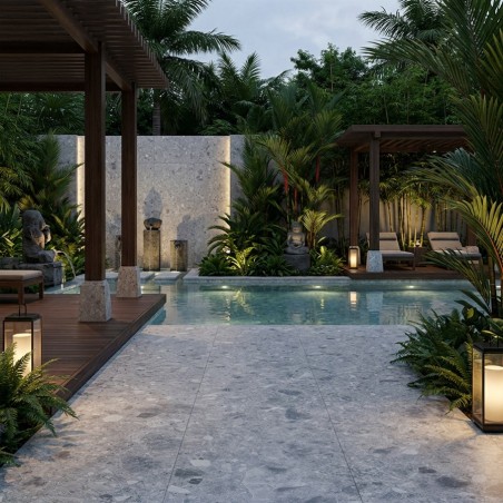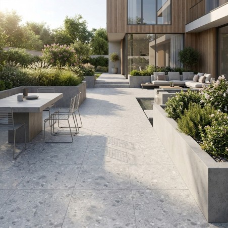 Dans sa couleur gris clair, la dalle offre une esthétique moderne, équilibrée et lumineuse. Ce gris clair s’adapte aussi bien aux terrasses contemporaines qu’aux aménagements minimalistes, tout en apportant une touche architecturale affirmée. Son aspect terrazzo, fidèle au caractère du Ceppo di Gré, crée une surface dynamique qui capte subtilement la lumière et structure l’espace.