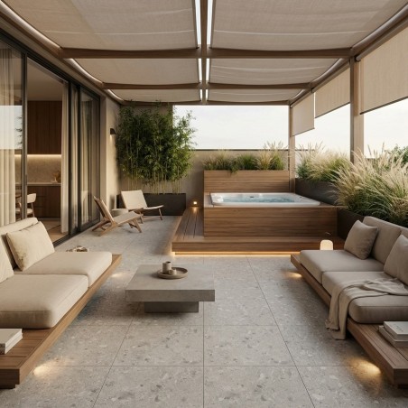 Avec son rendu terrazzo inspiré du Ceppo di Gré, la dalle GEOTECH Sand apporte une ambiance minérale douce et élégante à l’extérieur. Parfaite pour aménager une dalle sur plots terrasse, elle s’intègre aussi dans l’esprit dalle effet pierre. Antidérapante R11, elle se pose collé ou sur plots terrasse