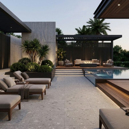 Chaque couleur ouvre une ambiance extérieure différente : Sand pour une terrasse lumineuse et chaleureuse, Light Grey pour un rendu architectural et équilibré, Grey pour une atmosphère contemporaine et nuancée, Ivory pour un espace doux et raffiné, et Anthracite pour une mise en scène forte et graphique.