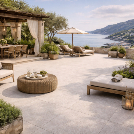 Équilibre parfait entre douceur et modernité, la dalle ATRIO Light Grey apporte une ambiance minérale chic à la terrasse. Elle est idéale pour un aménagement en dalle sur plots terrasse et s’accorde facilement avec l’esprit dalle effet pierre.