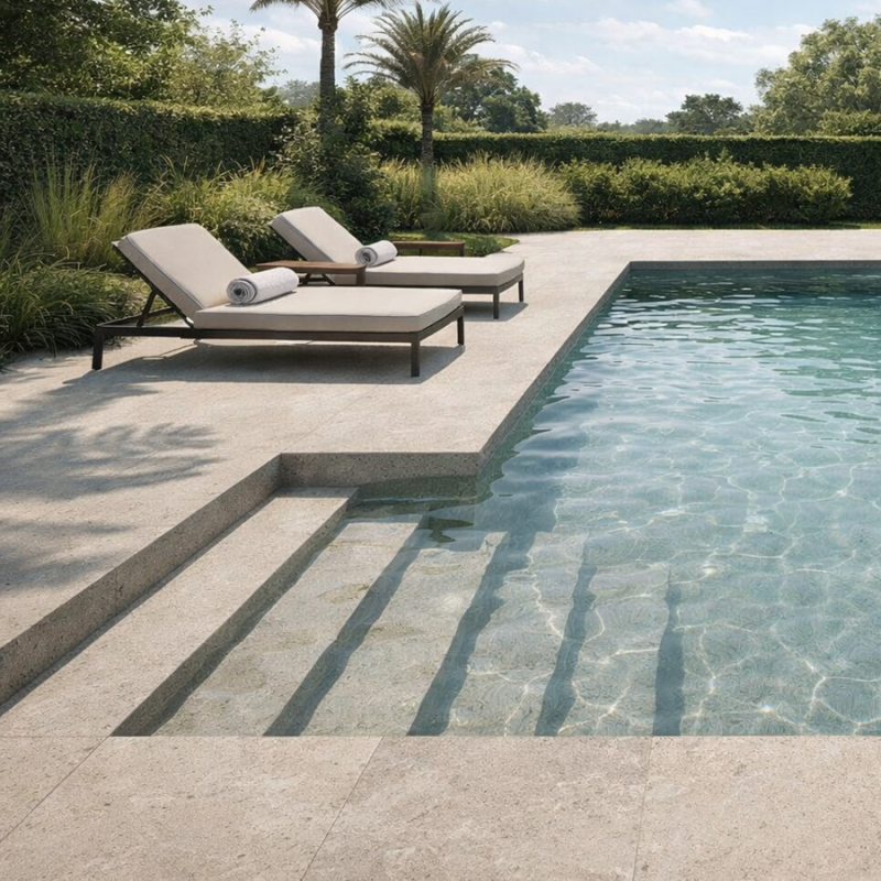 Il est recommandé de prévoir une pente d’écoulement adaptée et d’utiliser des produits compatibles avec les conditions extérieures. Un entretien régulier à l’eau claire ou avec un nettoyant au pH neutre permet de préserver durablement l’aspect naturel et les performances antidérapantes.
