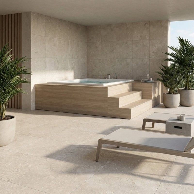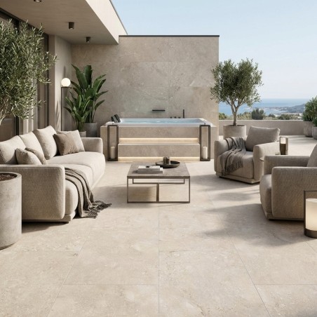 Son format 100x100 centimètres structure le sol extérieur avec élégance et limite les joints visibles, créant un rendu fluide et contemporain. Dotée d’une surface antidérapante R11, la dalle Belgio Sand assure confort et sécurité, même dans les zones humides comme les terrasses ou les plages de piscine.