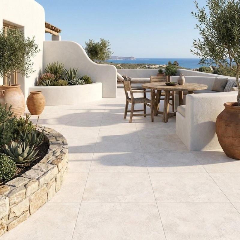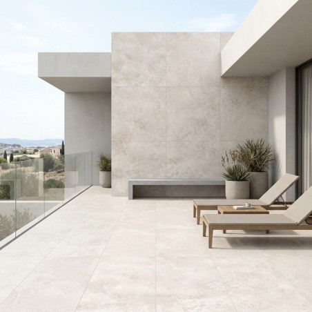 Son format carré 100x100 cm structure l’espace extérieur avec modernité et limite les joints visibles, pour un rendu fluide et architectural. Dotée d’une surface antidérapante R11, la dalle Stratos Cross White garantit confort et sécurité, y compris dans les zones humides et les espaces de circulation.