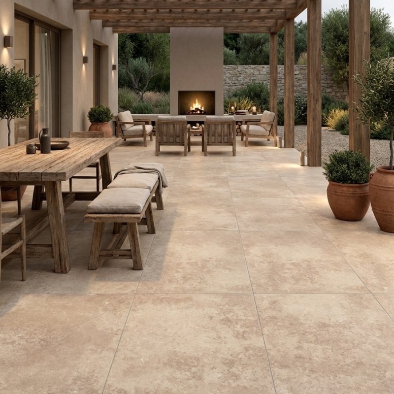 La dalle Ain Arena 60x120 cm s’inspire de l’aspect chaleureux de la pierre naturelle dans une teinte sable lumineuse. Sa surface subtilement nuancée apporte douceur et élégance aux espaces extérieurs, idéale pour créer une terrasse accueillante et naturelle.