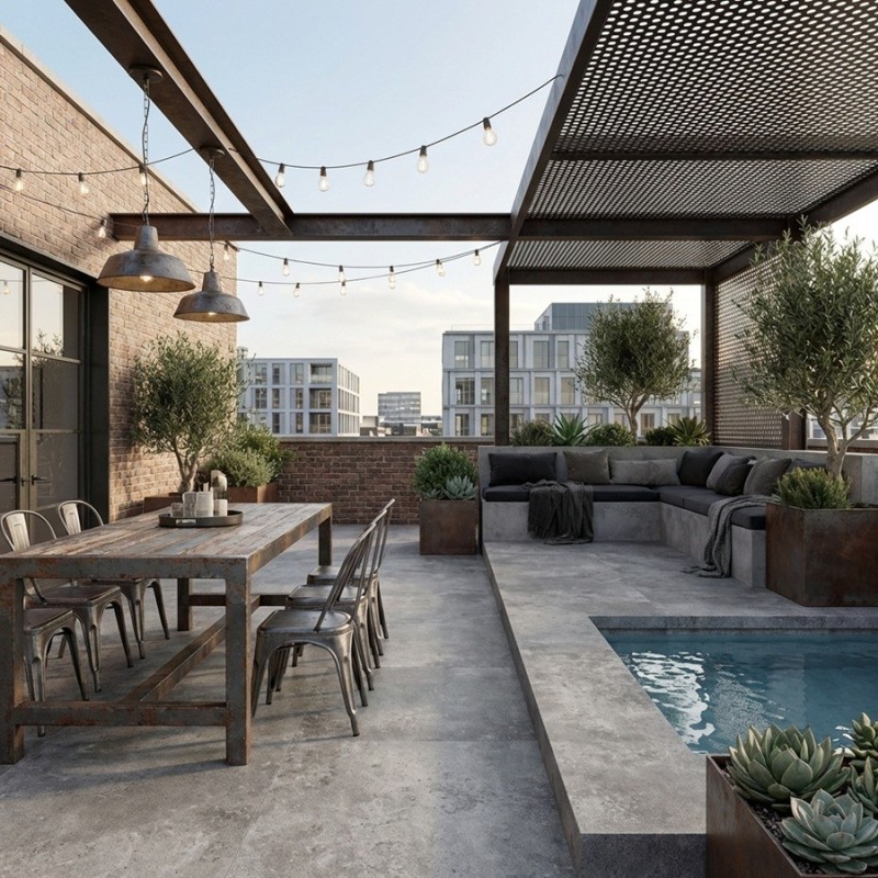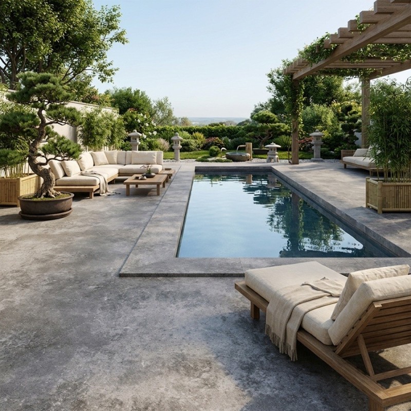 Elle peut être associée à des éléments en bois naturel afin de créer un contraste chaleureux entre matière minérale et texture naturelle. Cette combinaison fonctionne parfaitement pour les terrasses modernes ou les espaces détente au jardin.