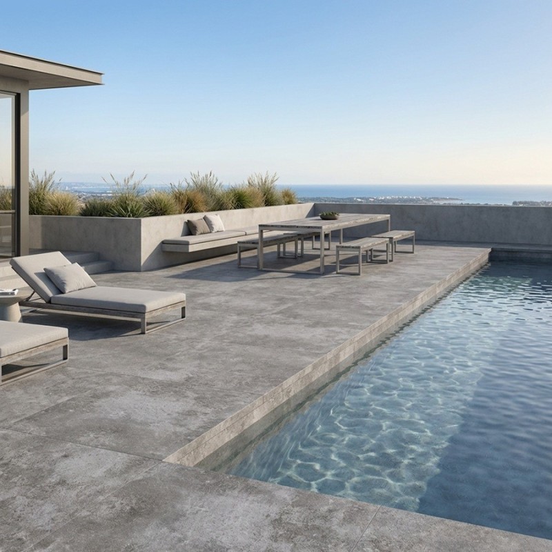 Grâce à sa finition antidérapante R11, cette surface assure une bonne adhérence, ce qui la rend particulièrement adaptée aux espaces extérieurs exposés à l’eau comme les terrasses, patios ou plages de piscine. Le grès cérame offre également une forte résistance au gel, à l’humidité et aux variations climatiques.