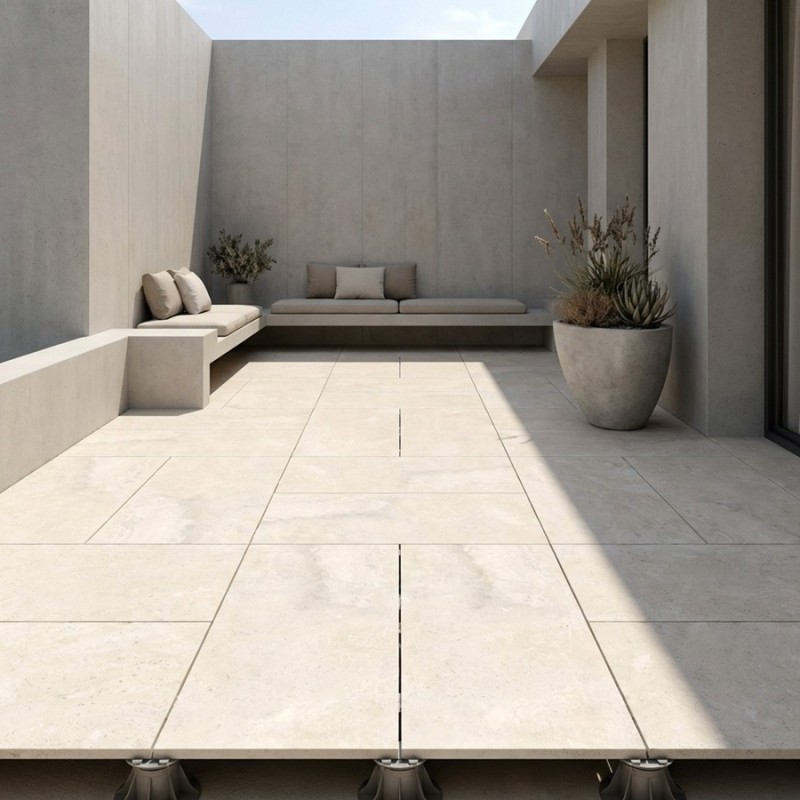La dalle Ankara peut également être installée sur plots pour créer une terrasse technique ou surélevée.