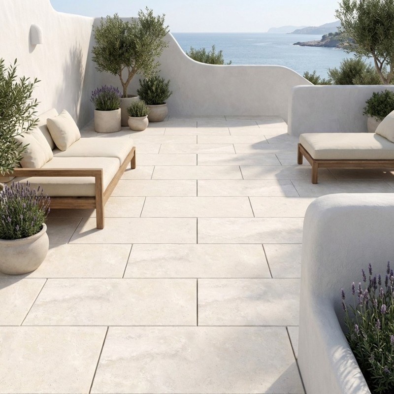La dalle Ankara gris clair s’intègre parfaitement dans les terrasses contemporaines grâce à son aspect pierre naturel et lumineux. Elle se marie facilement avec du mobilier de jardin moderne, des pergolas métalliques ou des éléments en béton architectural.