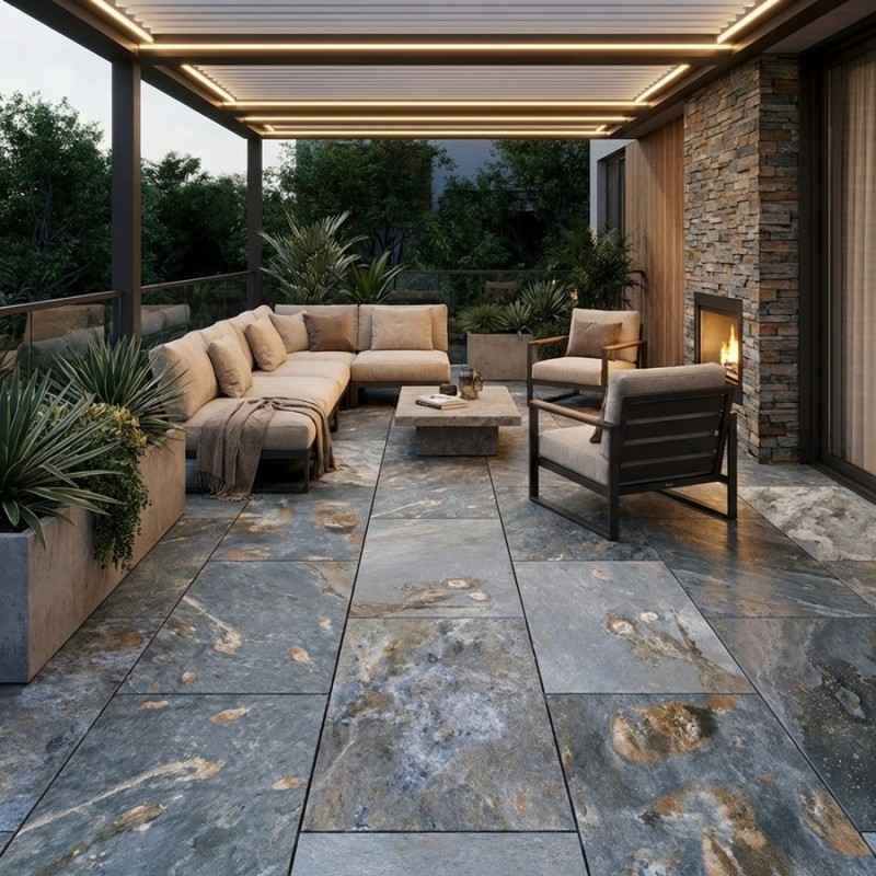 Fabriquée en grès cérame émaillé rectifié, cette dalle offre les performances d’un matériau moderne tout en reproduisant fidèlement l’aspect de la pierre naturelle. Elle résiste parfaitement à l’eau, au gel et aux variations climatiques, ce qui la rend idéale pour les aménagements extérieurs comme les terrasses ou les abords de piscine.