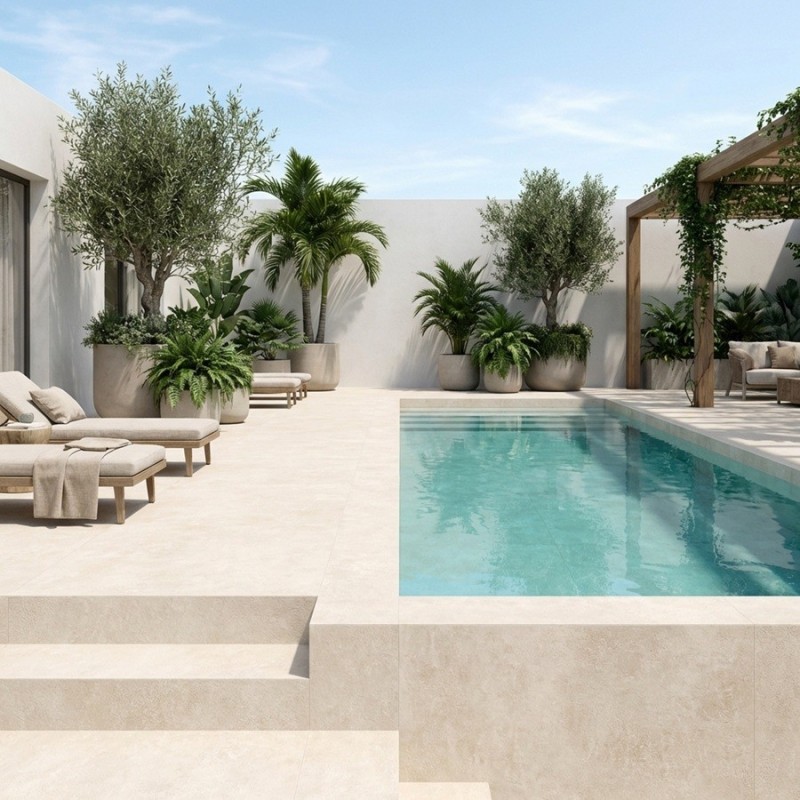 Le format 60x120 cm permet de structurer visuellement l’espace et d’apporter une touche contemporaine aux terrasses, patios et plages de piscine.
