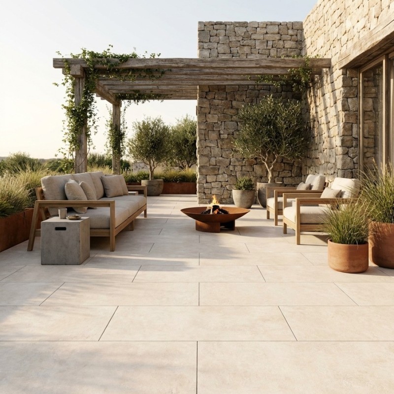 La dalle Concrete Desert Plus est idéale pour créer une terrasse contemporaine aux lignes épurées. Sa teinte claire s’associe facilement avec des façades modernes, des structures en béton ou du mobilier extérieur design.