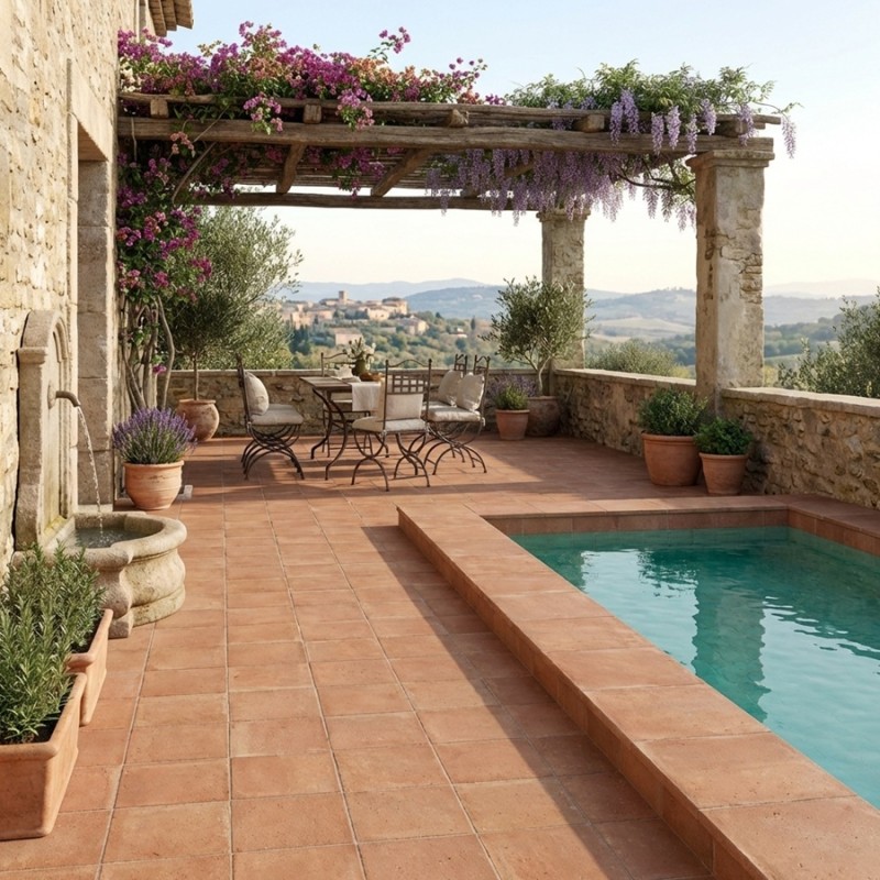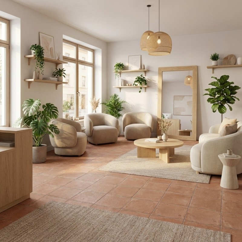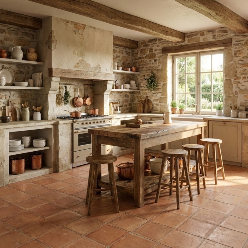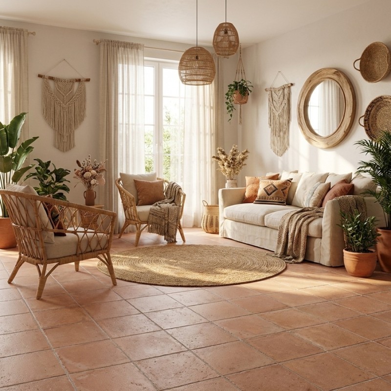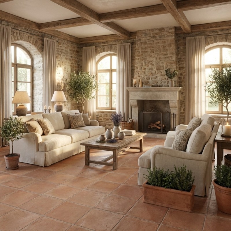 Ce carrelage en terre cuite est particulièrement apprécié dans les projets de rénovation de maisons anciennes, d’intérieurs de caractère ou d’ambiances campagne chic. Il trouve naturellement sa place dans un salon, une cuisine ou une chambre, où il réchauffe visuellement l’espace tout en conservant une élégance sobre et intemporelle.