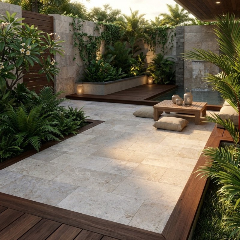 Ce revêtement haut de gamme convient aussi bien aux zones extérieures qu’aux espaces intérieurs, notamment les pièces ouvertes sur le jardin, les murs décoratifs ou les zones humides.