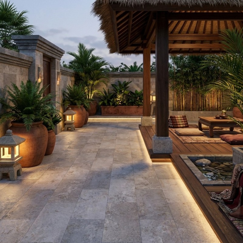 Le Caribbean White s’intègre parfaitement dans une ambiance balinaise revisitée, où la pierre naturelle, le bois et les tons beige et gris clair se mêlent à la lumière.