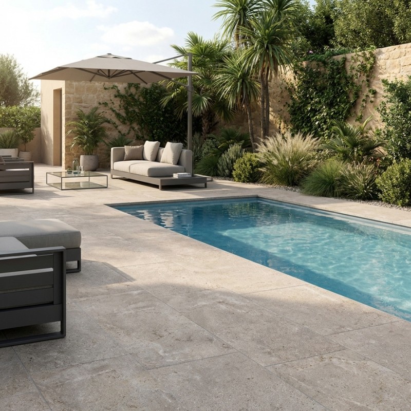 Ce produit premium est idéal pour un revêtement extérieur de piscine ou de terrasse, où esthétique, sécurité et qualité se rejoignent dans une même harmonie naturelle.