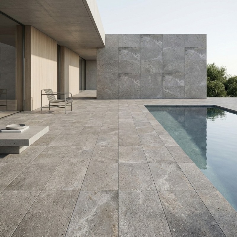 Sa surface structurée et sa couleur gris minéral confèrent au revêtement un rendu moderne, résistant et intemporel.