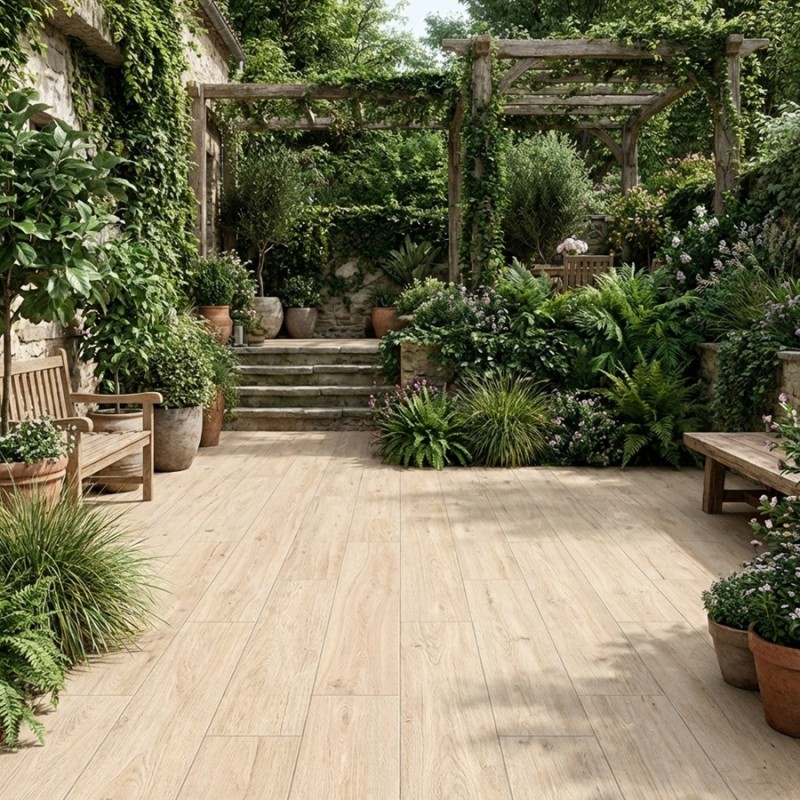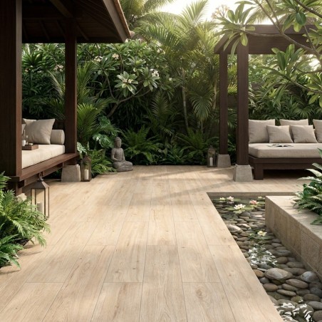 Le carrelage IRATI Arce 20x120 reproduit à la perfection le bois naturel, avec ses veinures fines et ses nuances dorées rappelant le chêne clair. Sa couleur lumineuse et sa finition R11 antidérapante le rendent parfait pour une pose en extérieur autour d’une piscine ou sur une terrasse moderne.