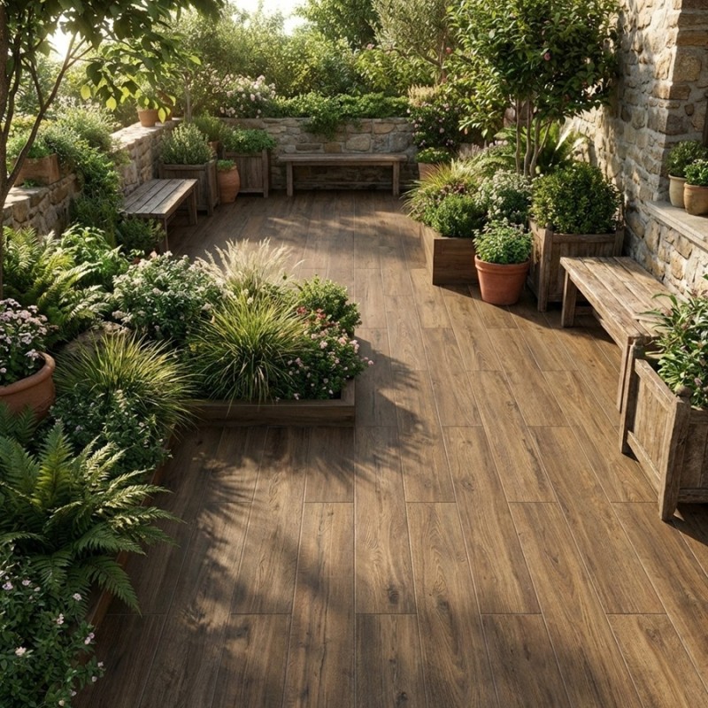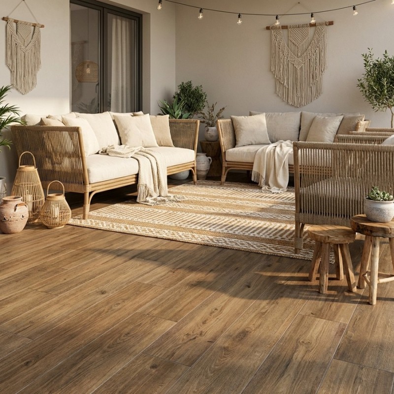Le carrelage IRATI Teak imitation bois se prête à de nombreuses ambiances :