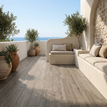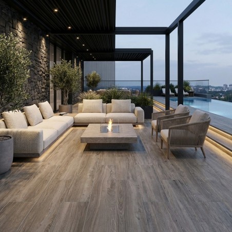 Son aspect bois grisé et sa texture élégante en font un revêtement de sol sobre et raffiné, adapté à tous les espaces extérieurs modernes.