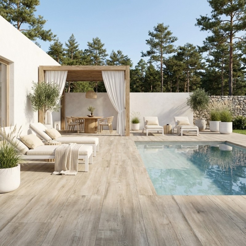Son format lame 22,5x90, similaire à une planche de parquet, permet une pose droite ou décalée et crée un sol extérieur harmonieux, lumineux et visuellement équilibré. Ce style convient aussi bien aux terrasses contemporaines qu’aux ambiances plus naturelles ou bord de mer.
